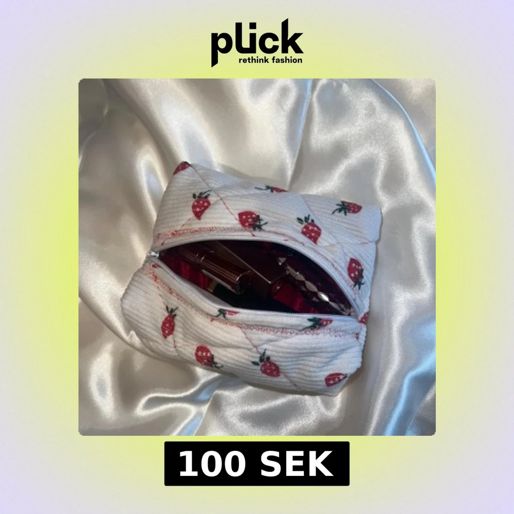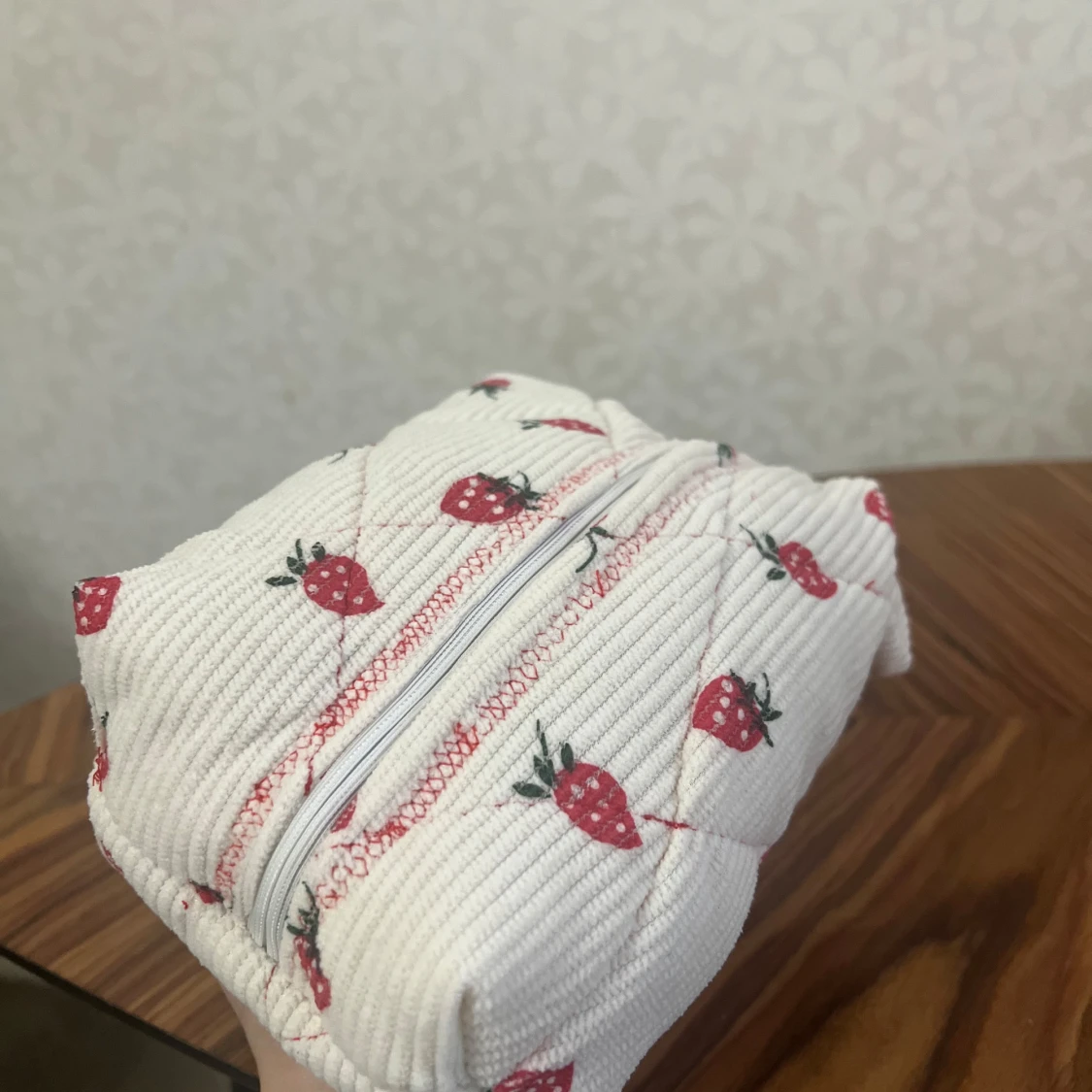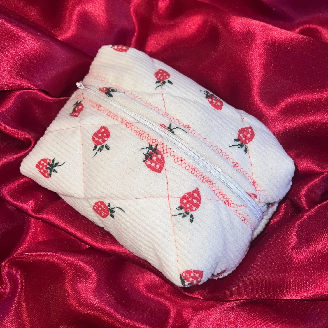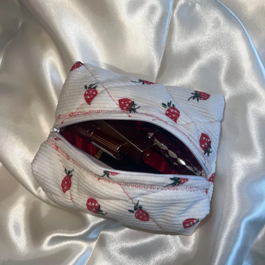 Supergullig liten handgjord sminkväska i vit manchester med quiltad struktur och sött jordgubbsmönster. Väskan har dragkedja upptill och är perfekt för att bära småsaker. Perfekt accessoar för dig som gillar unika detaljer och lekfull stil.