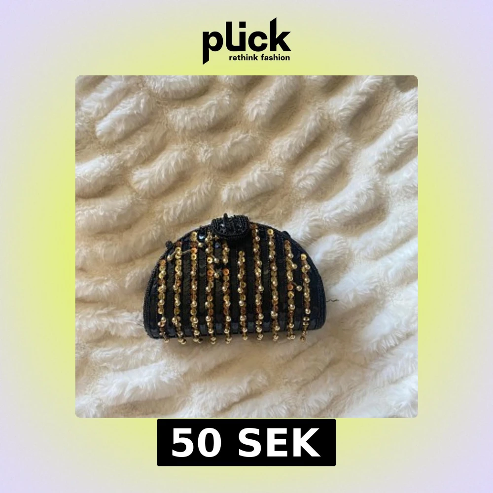 Unik svart axelväska i halvmåneform med glittriga paljetter och vertikala ränder i guld och brons. Väskan har en smal axelrem och stängs med magnetlås. Perfekt för att lyfta din outfit med extra bling och cool vintagekänsla.