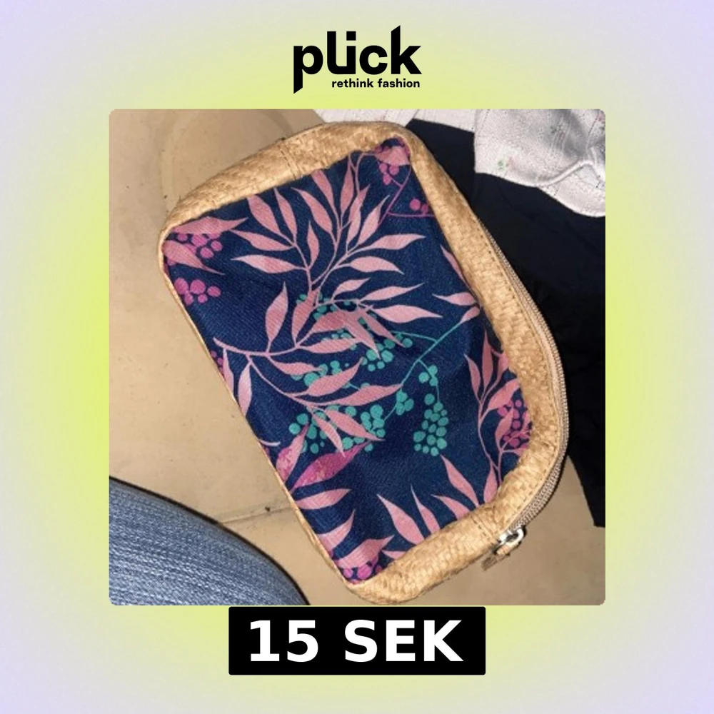 Säljer en unik necessär med beige flätad utsida och blå tygpanel med rosa och gröna blommönster. Väskan har dragkedja, perfekt för småprylar eller smink. Superfin att ha i väskan eller som clutch till vardags.
