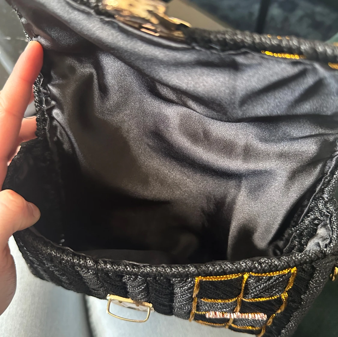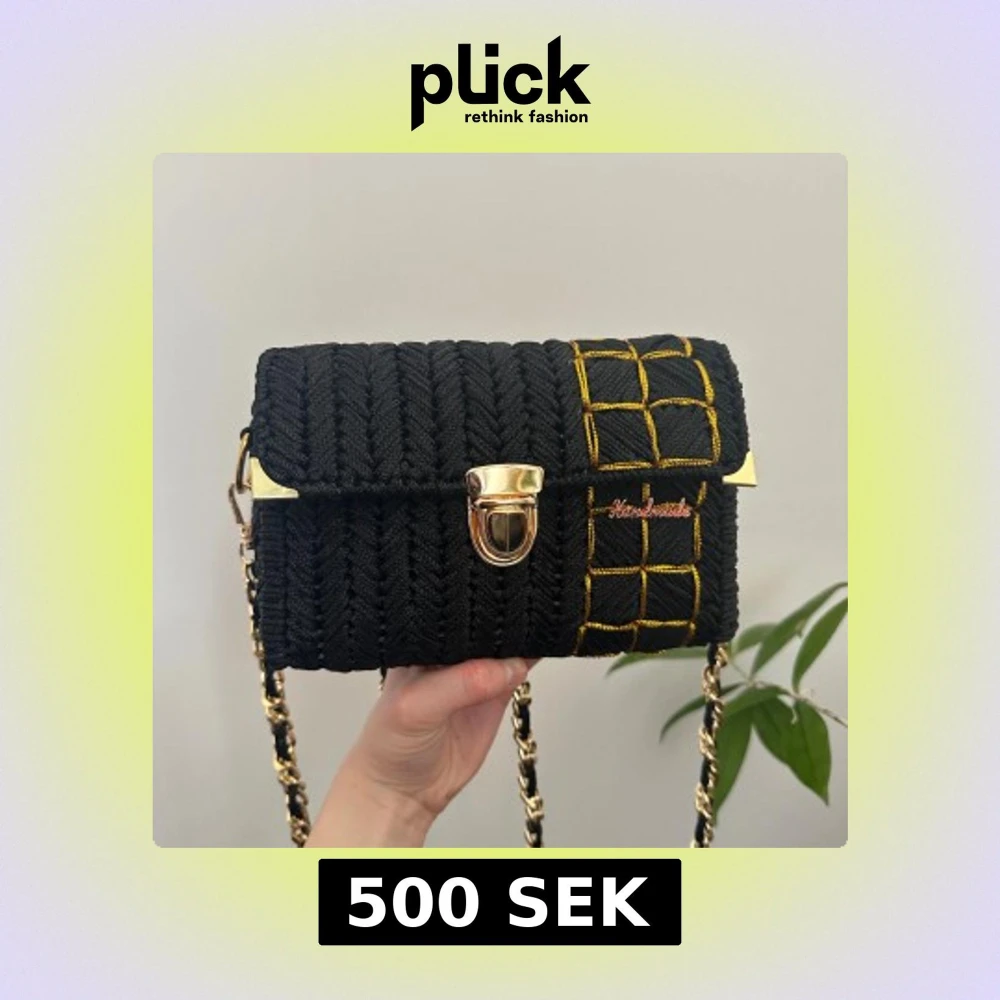 Handmade av min mamma! đSnygg svart handvĂ€ska med flĂ€tat mönster och gulddetaljer. VĂ€skan har en elegant guldkedja som axelrem och ett stilrent spĂ€nne framtill. Perfekt för att ge en touch av glamour till din outfit.