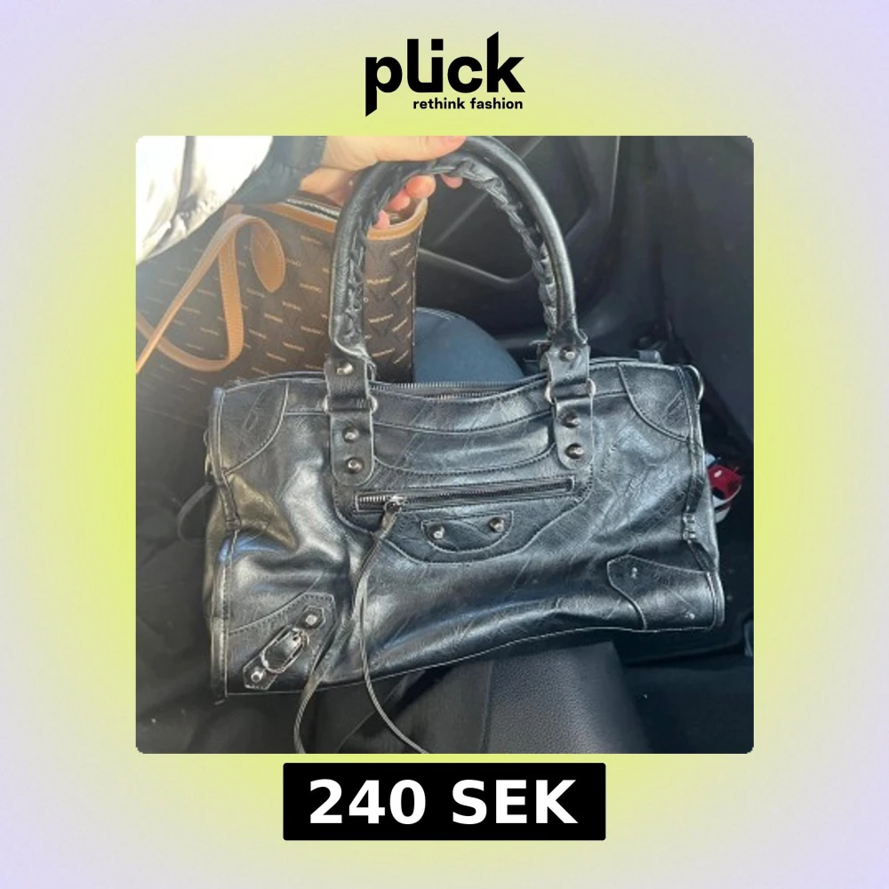 Snygg svart handväska i skinn med flätade handtag och dragkedja. Väskan har flera nitar och detaljer som ger en cool look. Perfekt för att bära dina dagliga nödvändigheter med stil.