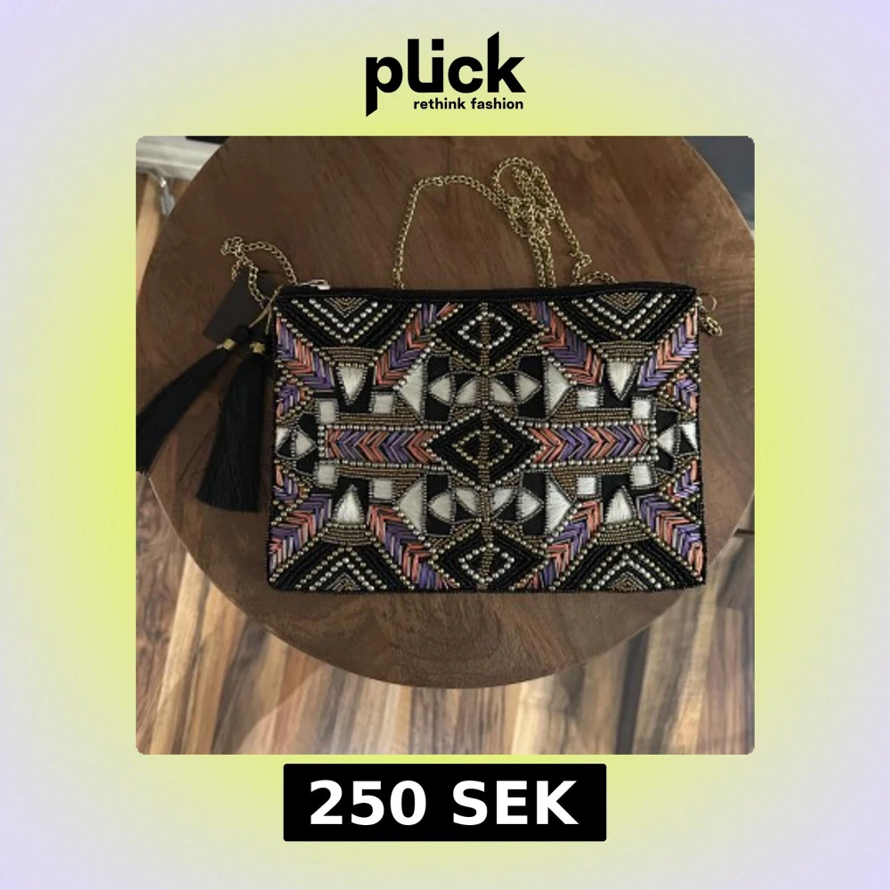 Snygg kuvertväska med ett färgglatt geometriskt mönster i svart, lila, rosa och vitt. Väskan har en elegant guldkedja och en dekorativ tofs. Perfekt för att ge din outfit en unik touch.