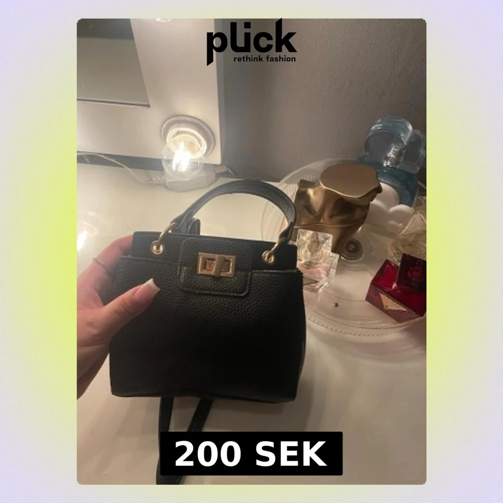 Säljer en stilren svart handväska med guldfärgade metalldetaljer och ett snyggt spänne framtill. Väskan har både handtag och axelrem, perfekt för att bära på olika sätt. Knappt använd