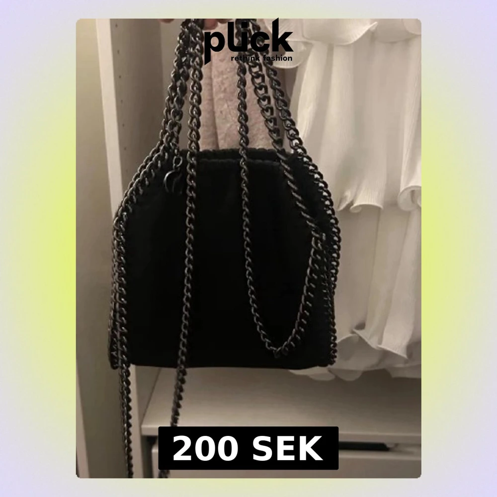 Säljer en svart axelväska med grova kedjor som axelremmar och dekor runt kanterna. Väskan har en mjuk, fyrkantig form och är perfekt för dig som gillar en cool och stilren look. Materialet är skinnliknande och kedjorna ger en edgy vibe.