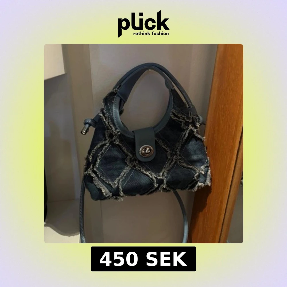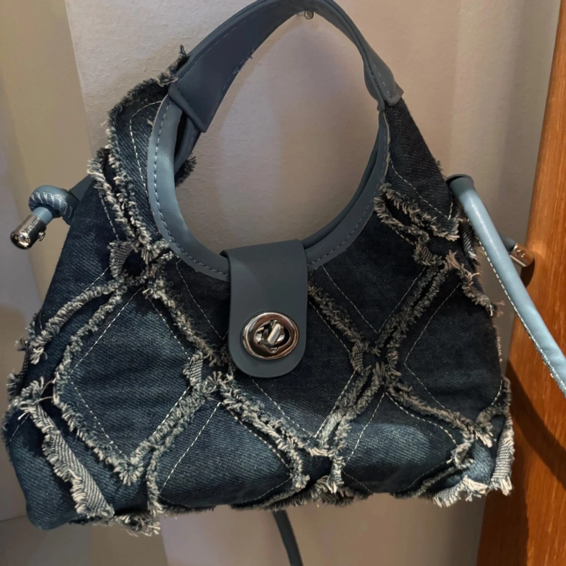 Jätte cool väska med jeans tyg. Den har ett längre band och vanligt Väsk handtag. Andvänt 1 gång. Jätte cool med jeans och perfekt till sommaren