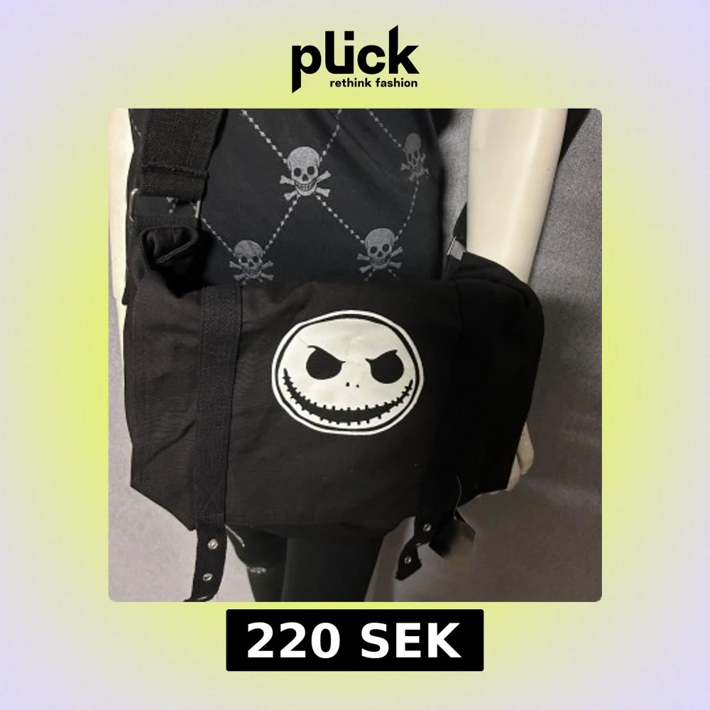 Cool svart axelväska med stort vitt Jack Skellington-tryck på framsidan. Väskan har justerbar axelrem och spänndetaljer. Perfekt för dig som gillar alternativ stil och vill ha en unik accessoar.
