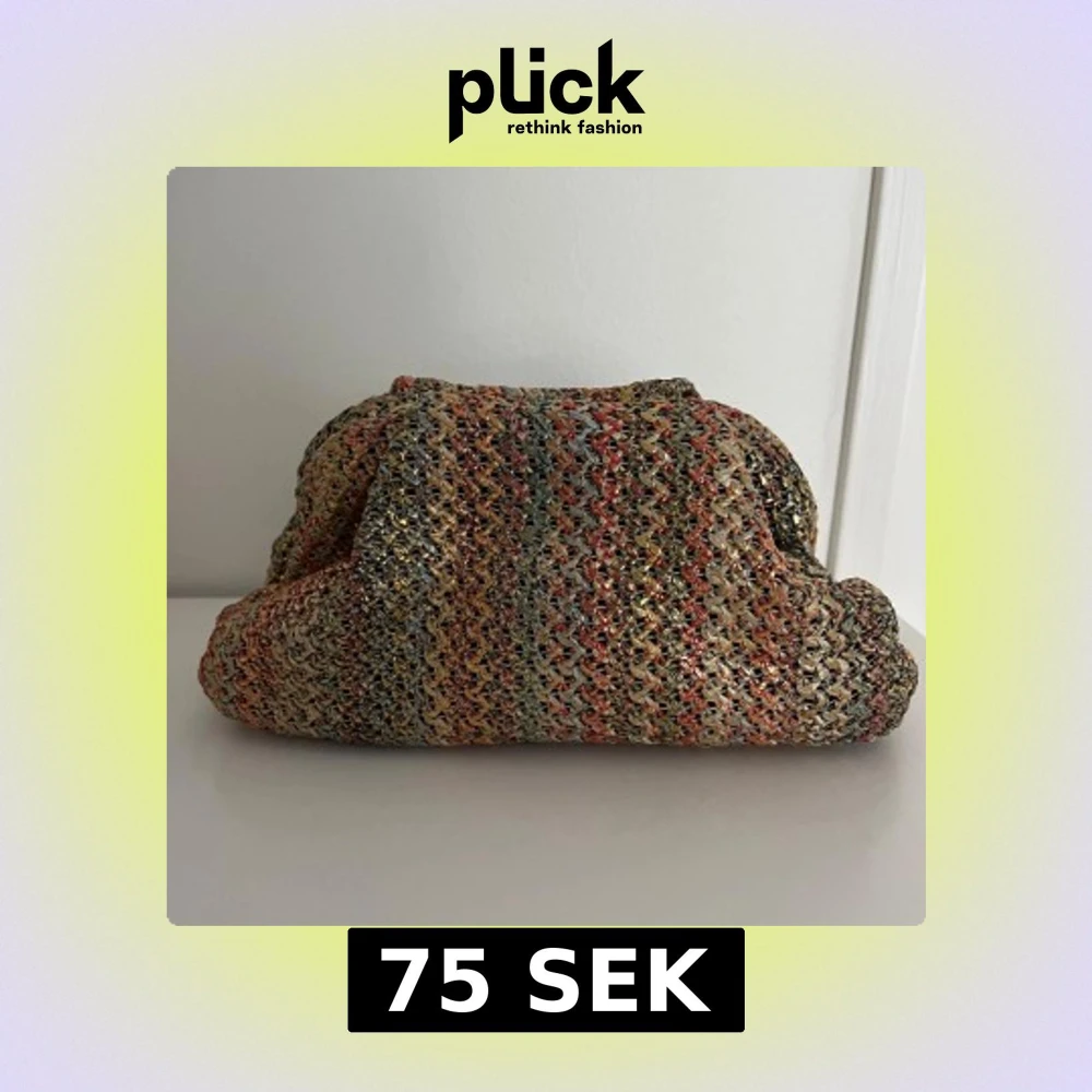 Säljer en unik flerfärgad stickad handväska med ett mönster i guld, rött och grönt. Väskan har en rymlig insida med svart foder och stängs med en praktisk dragkedja. Perfekt för att ge din outfit en färgglad touch!