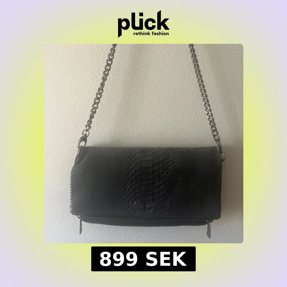 Säljer en svart axelväska med snyggt ormmönster och silverfärgad kedjerem. Väskan har dragkedja på baksidan och en stilren design som passar till många outfits. Perfekt storlek för det viktigaste du vill ha med dig. Väskan är använd ca 3 gånger, ingen skada eller repa.