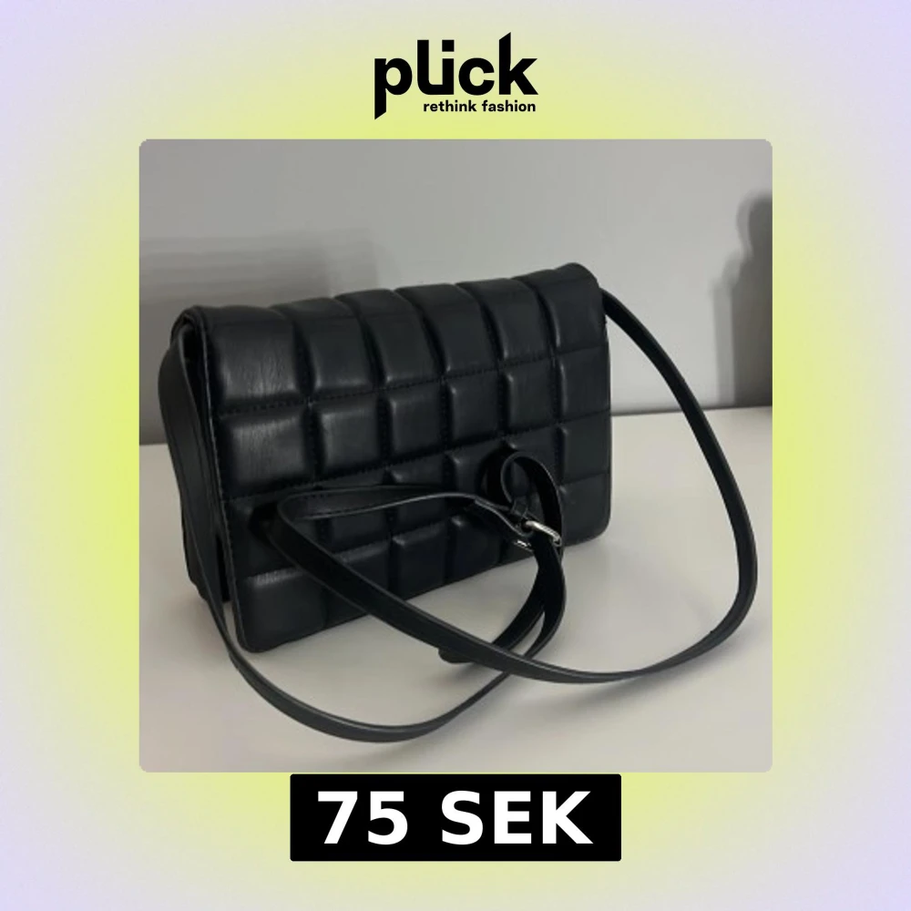 Säljer en svart quiltad axelväska med stilren design och justerbar rem. Väskan har ett rutmönster och är perfekt för att bära dina viktigaste saker. Enkel att matcha med olika outfits.