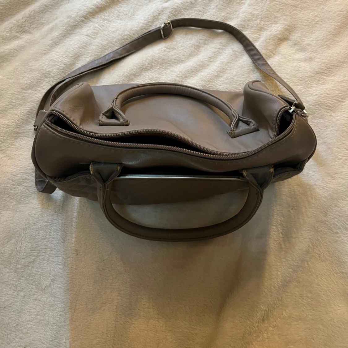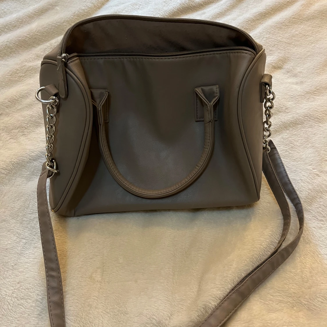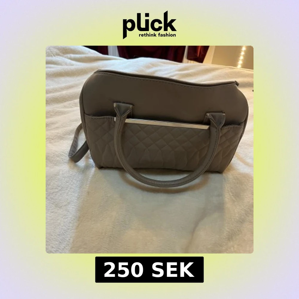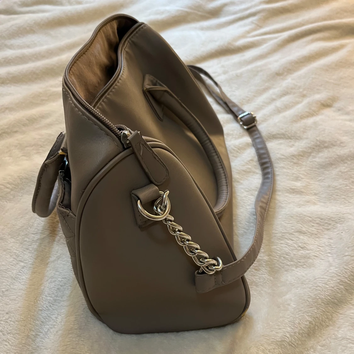 Säljer en beige handväska med quiltad framsida och snygga silverfärgade kedjedetaljer på sidorna. Väskan har både handtag och en justerbar axelrem samt dragkedja upptill. Perfekt för dig som vill ha en stilren och rymlig accessoar.