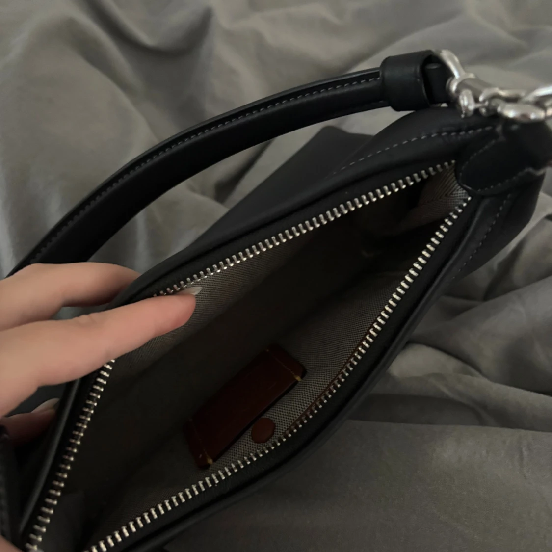 Stilren svart axelväska från Coach i slätt skinn med silverfärgade metalldetaljer och dragkedja. Väskan har ett klassiskt C-emblem framtill och en avtagbar tag. Invändigt finns ett fack med knappstängning. Perfekt storlek för det viktigaste. Köpt för 4600, säljer för 4000. Kan gå ner vid snabb affär