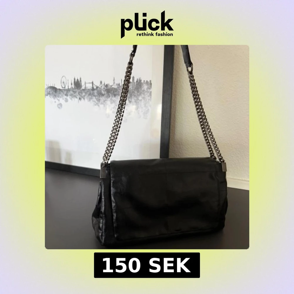Stilren svart axelväska i mjukt skinn med silverfärgad kedjerem. Väskan har flera fack inuti, inklusive ett med dragkedja, och stängs med magnetlås