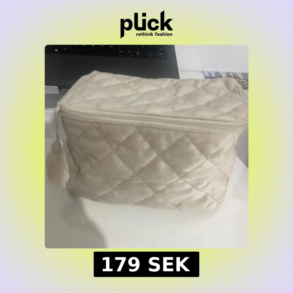 Snygg beige necessär med quiltat mönster och mjuk sammetkänsla. Väskan har dragkedja med en dekorativ tofs och är perfekt för smink eller småprylar. Stilren och praktisk design som passar i väskan eller på resan.