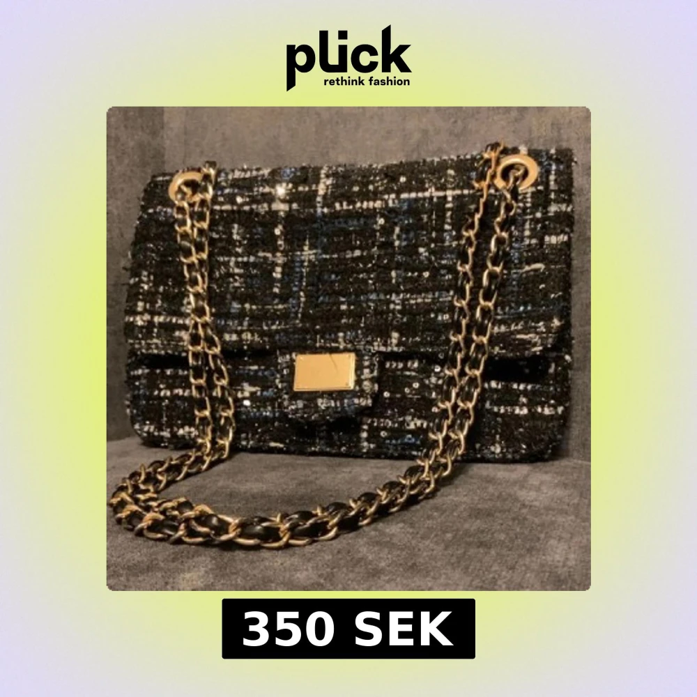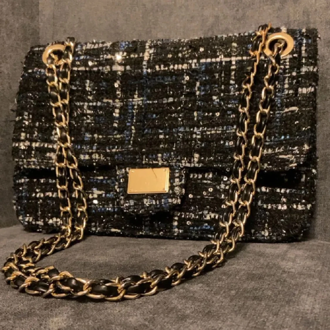 Snygg svart axelväska med glittrigt mönster och guldfärgad kedja. Jätte fin till våren