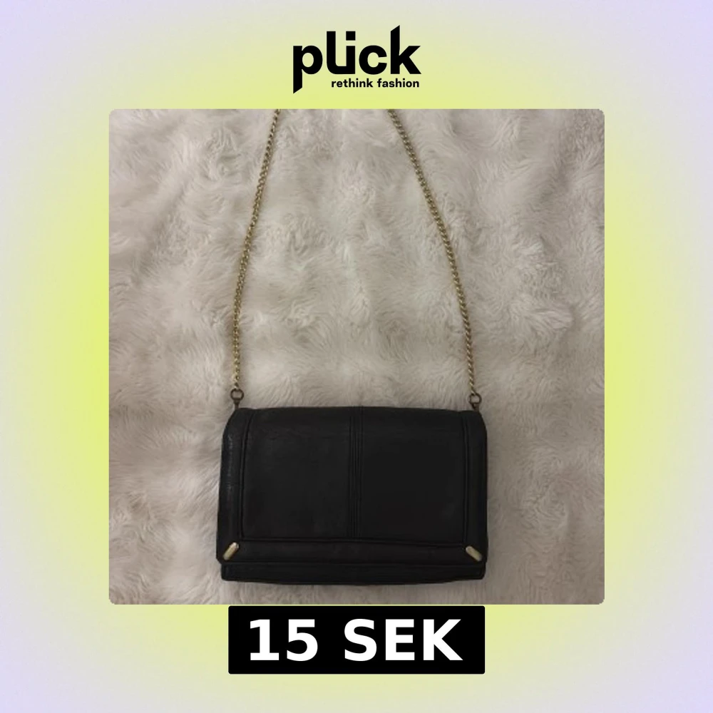 Svart axelväska i skinnmaterial med guldfärgade detaljer och kedja. Väskan har en rektangulär form, magnetlås och minimalistisk design. Perfekt storlek för det viktigaste och många rymliga fack i en liten väska. Hyfsat mycket slitage därav priset som också kan diskuteras💗