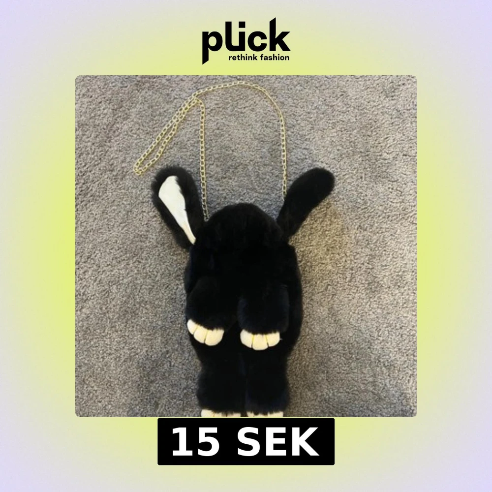 Unik axelväska i form av en svart kanin med mjuk pälsimitation och vita detaljer på öron och tassar. Väskan har en guldfärgad kedja som axelrem och öppnas med dragkedja.