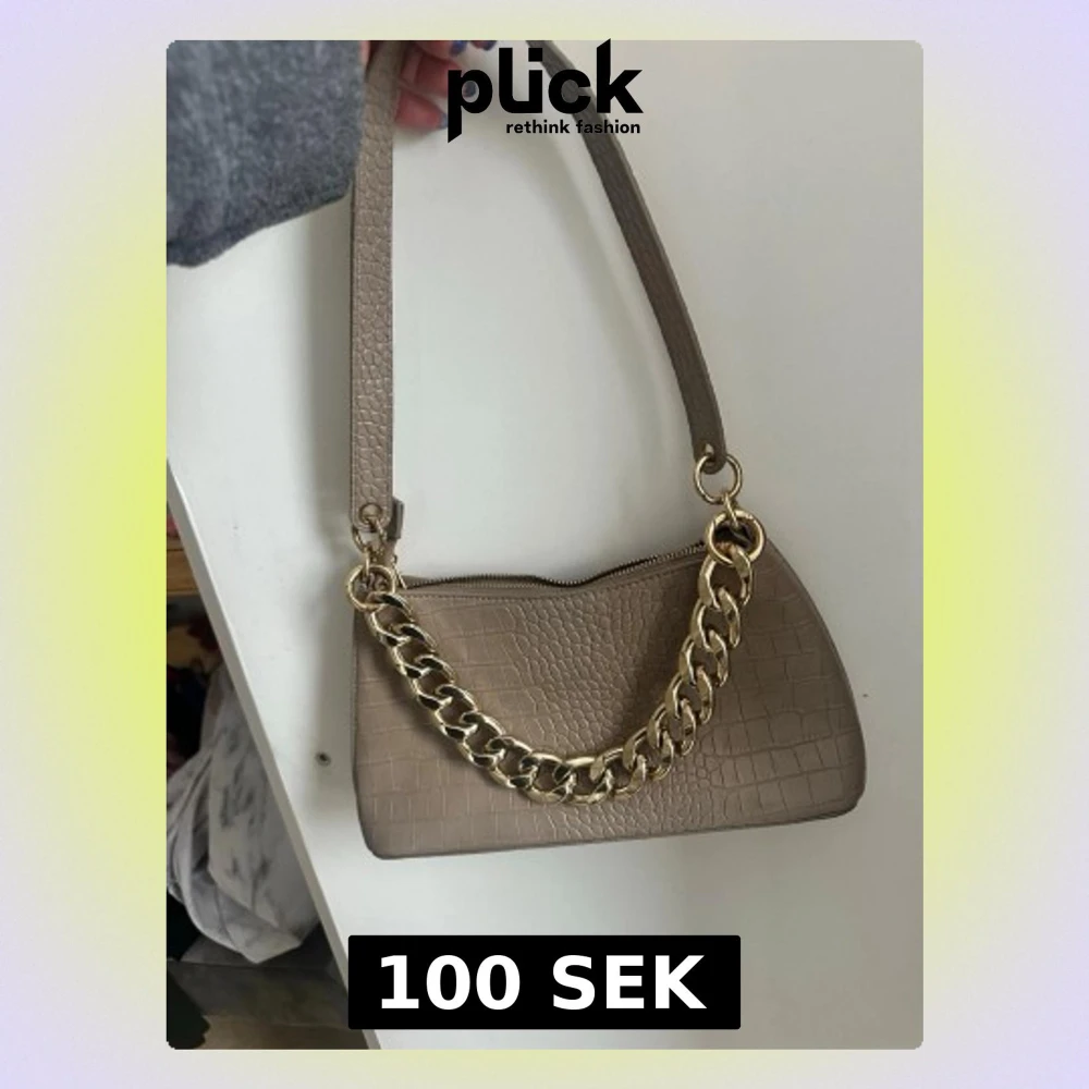 Stilren beige handväska i krokopräglat material med en chunky guldfärgad kedjedetalj framtill. Väskan har ett kort axelband och stängs med dragkedja. Perfekt accessoar för att lyfta din outfit.