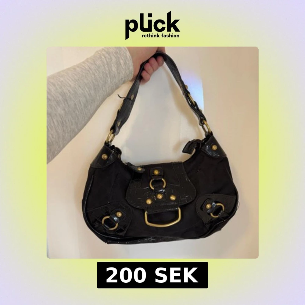 Snygg svart axelväska med gulddetaljer och flera spännen.