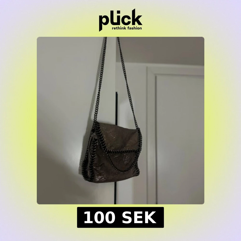 Säljer en glittrig axelväska i metallic-brun färg med svarta kedjedetaljer runt kanterna och som axelrem. Väskan har lock med tryckknapp och är perfekt för att lyfta din outfit.