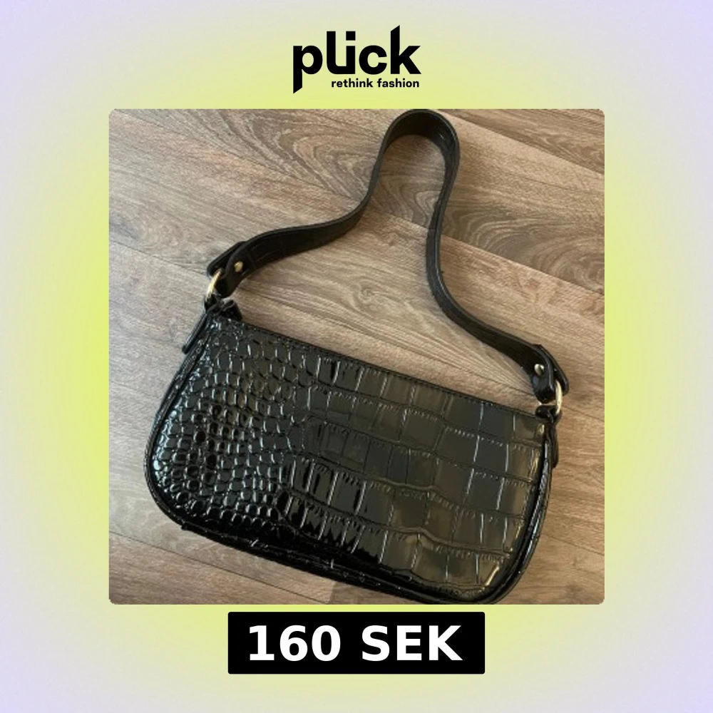 Säljer en svart axelväska med glansig yta. Väskan har en bred axelrem och guldfärgade metalldetaljer. Perfekt för att lyfta vilken outfit som helst. säljer den för 160kr