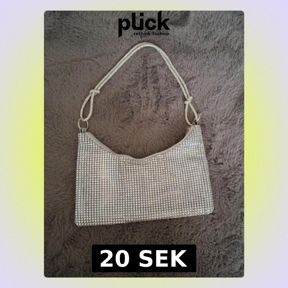 Säljer en snygg axelväska i silver med glittriga stenar över hela väskan. Den har ett rektangulärt format och ett matchande axelband med knutdetaljer. Väskan stängs med dragkedja och är perfekt för att lyfta vilken outfit som helst.