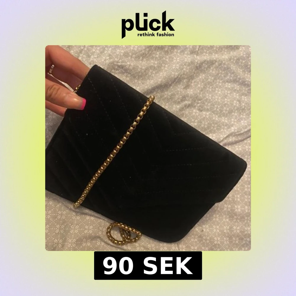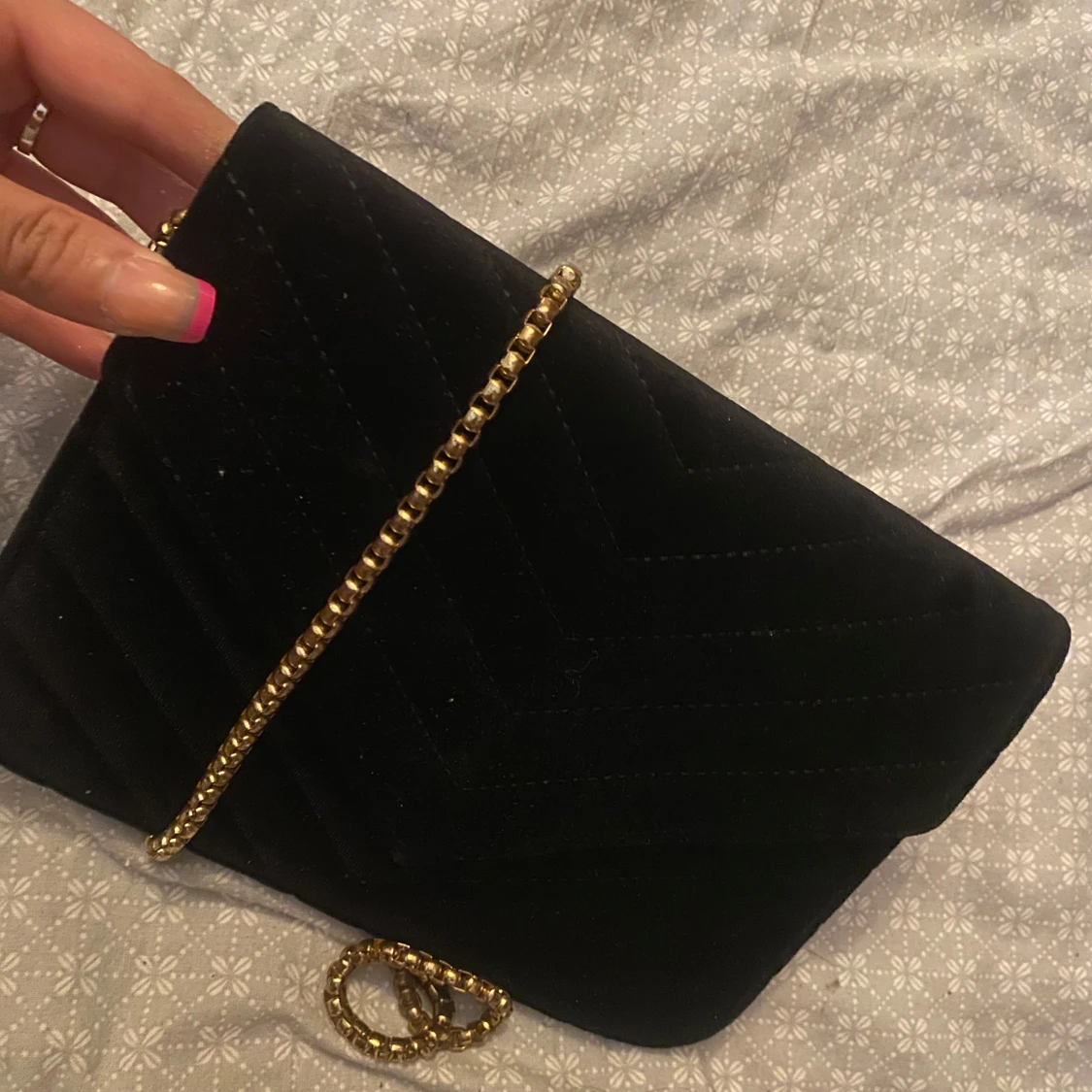 Stilren svart kuvertväska i sammet med quiltad design och guldfärgad kedjerem. Perfekt för att lyfta din outfit med en lyxig touch. Väskan har en klassisk form och känns både trendig och tidlös.