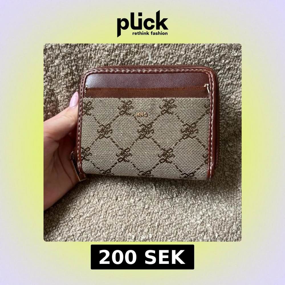 Köpt för 450 Ish.Snygg plånbok från Mango i beige och brunt med rutigt mönster och bruna skinnkanter. Plånboken har dragkedja runtom och flera fack för kort och sedlar. Perfekt storlek för att ha med sig överallt däremot har den lite skador men ändå fin🥰