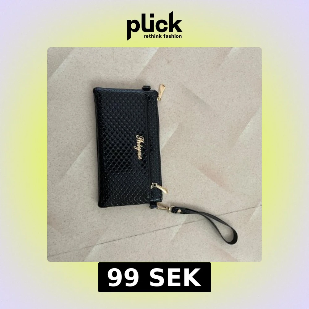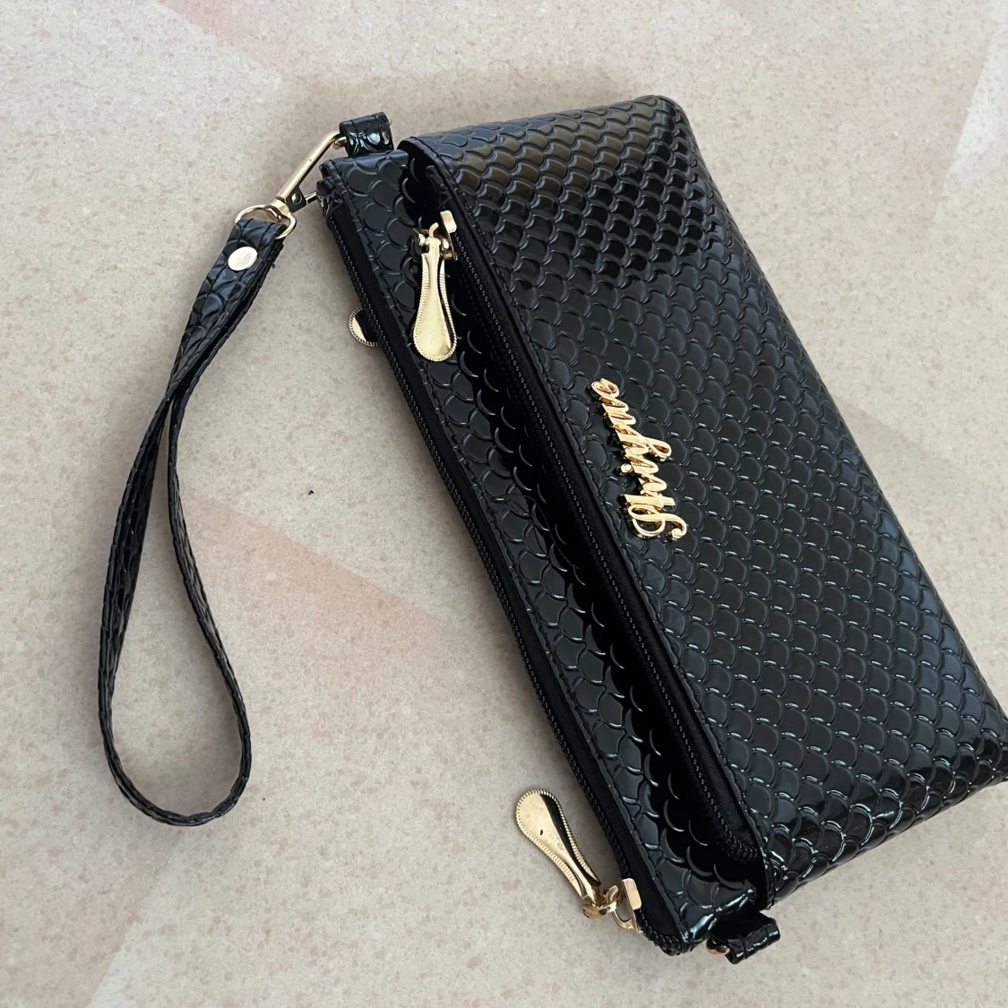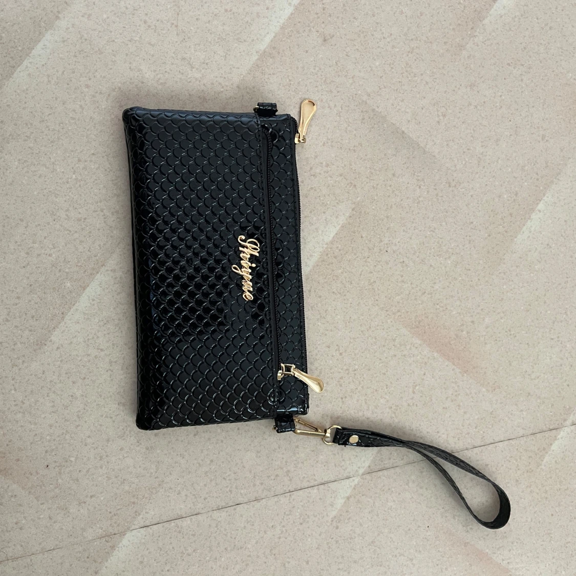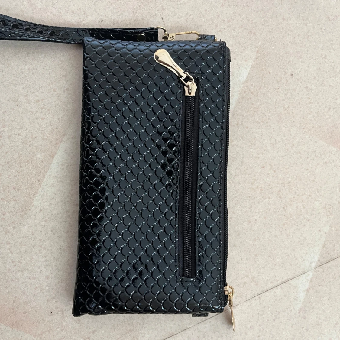 Snygg svart kuvertväska från Shizjune med glansig yta och fiskfjällsmönster. Väskan har guldfärgade detaljer, dragkedjor och en avtagbar handledsrem. Perfekt för att bära det viktigaste och ge din outfit en extra touch.