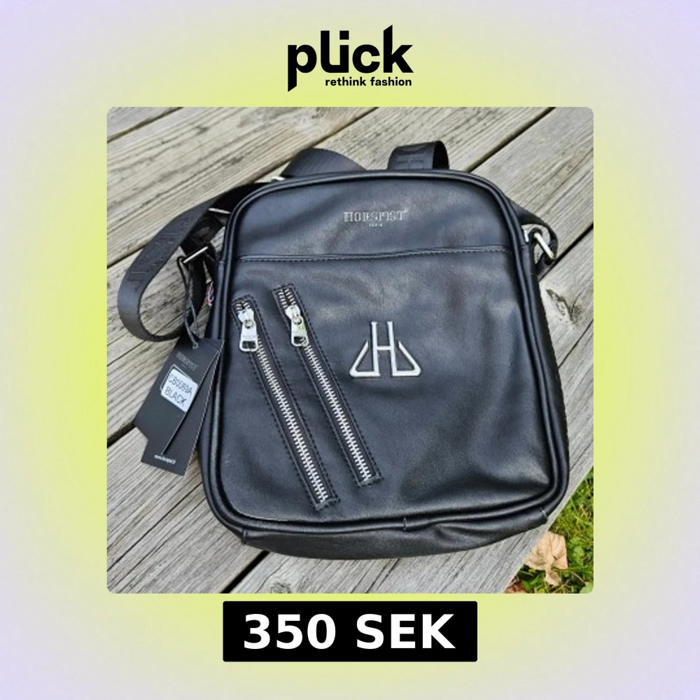 Snygg svart läder axelväska från Horspist Paris i skinn med två sneda dragkedjor framtill och silverfärgad logga. Väskan har justerbar axelrem och stilren, fyrkantig form. Perfekt för att bära dina essentials med stil.