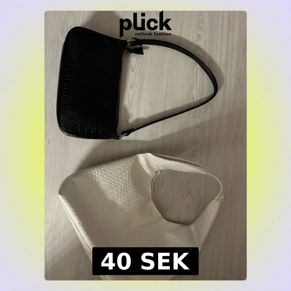 Två stilrena axelväskor, en i svart och en i vitt, båda med crocopräglat mönster. Den svarta har en klassisk, avlång form och smal axelrem medan den vita är större och mjukare i modellen. Perfekta för att lyfta vilken outfit som helst. Säljer båda tillsammans, man kan köpa enskild oxå