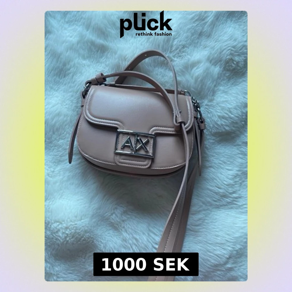 Snygg beige handväska från Armani Exchange med silverfärgad logga framtill. Väskan har både ett kort handtag och en lång axelrem, perfekt för att bära på olika sätt. Tillverkad i slätt skinnliknande material och stängs med lock.