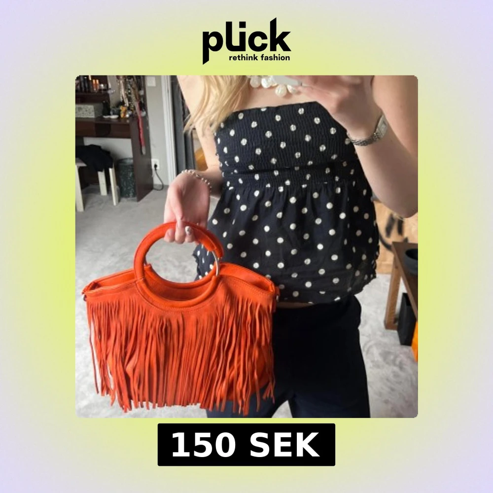 Snygg orange handväska med fransar som ger en bohemisk touch. Väskan har en rundad form och är tillverkad i skinn. Den har en praktisk dragkedja på baksidan för extra förvaring. Perfekt för att liva upp vilken outfit som helst!