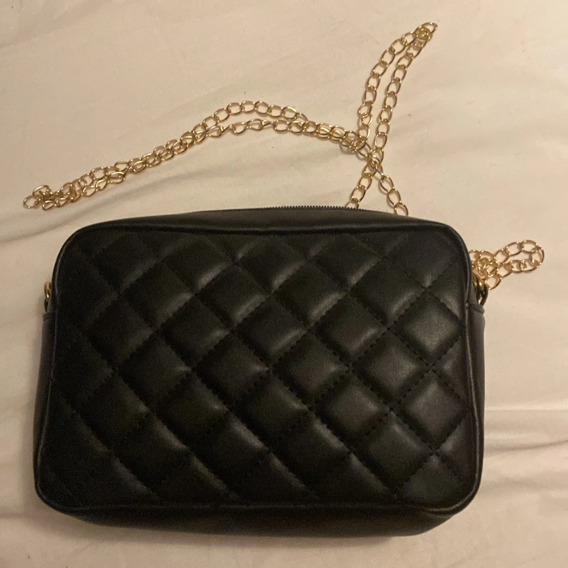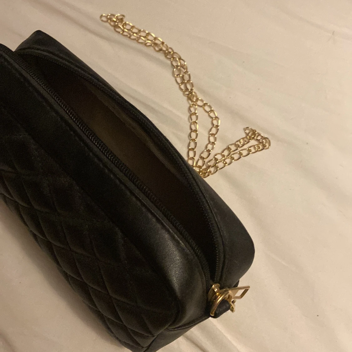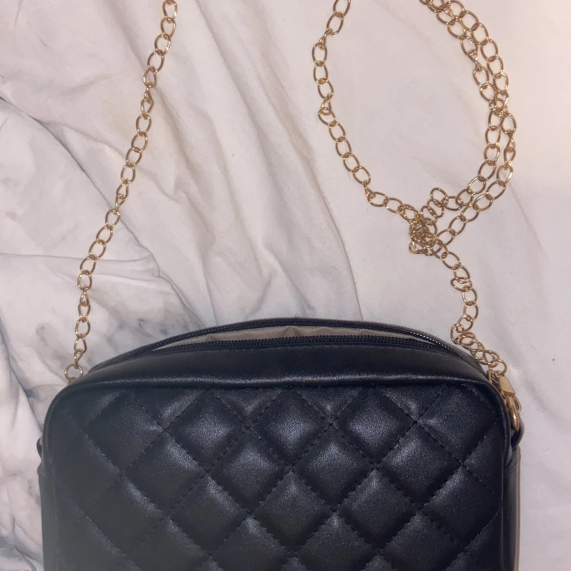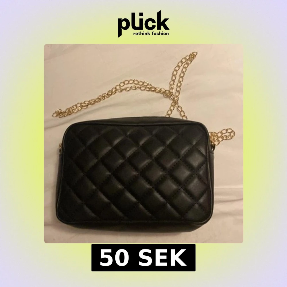 Säljer en svart axelväska med snygg guldfärgad kedja som axelrem.