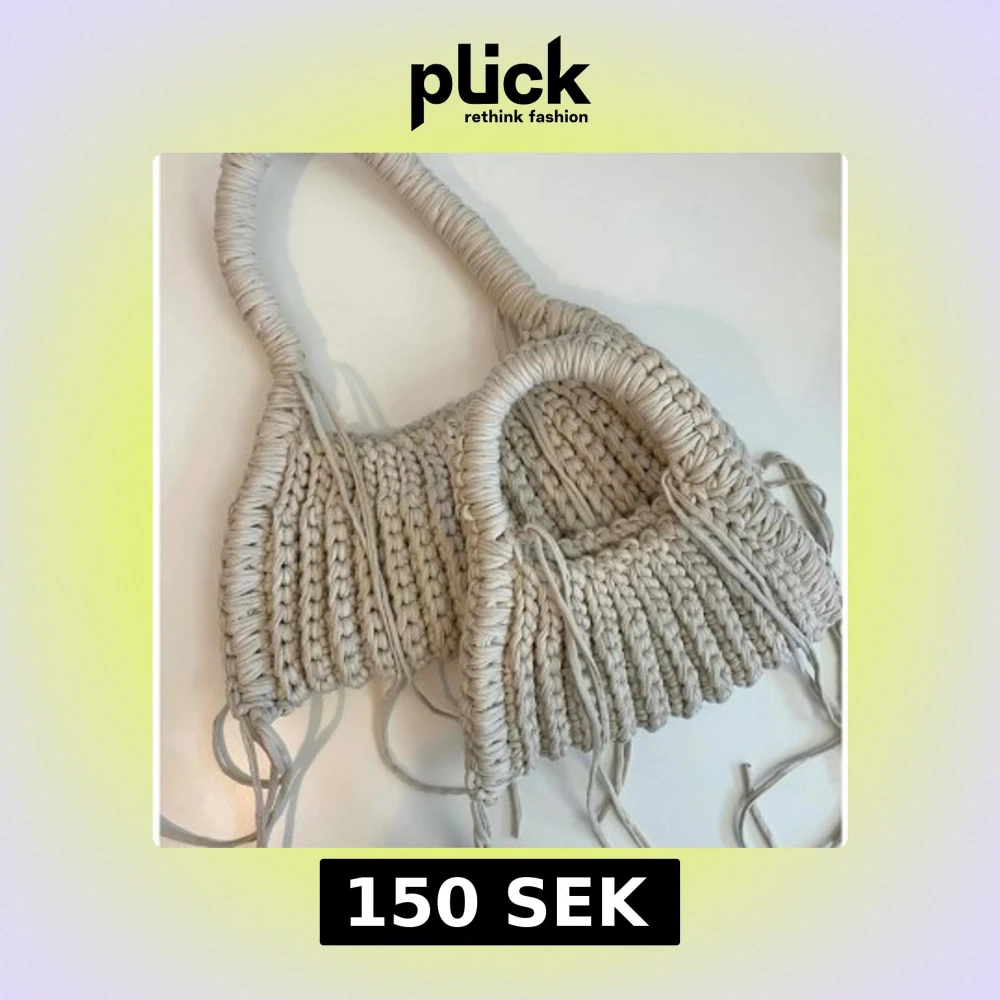 Säljer en beige stickad axelväska med grova handtag och coola knytband längs sidorna. Väskan har en unik, handgjord känsla och passar perfekt för dig som gillar boho-stil. Rymmer det viktigaste och är superenkel att slänga över axeln.
