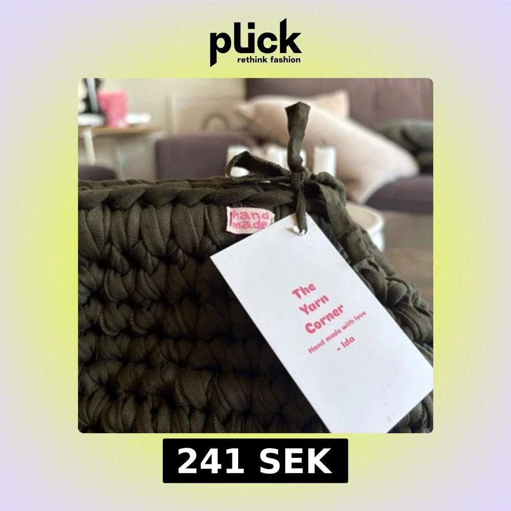 Unik handgjord kuvertväska i mörkgrönt, grovstickat tyg. Väskan har en rektangulär form och är tillverkad av mjukt bomullsmaterial. Perfekt för dig som gillar personliga accessoarer med en cool, chunky look. Märkt med 'hand made' och knytband upptill.