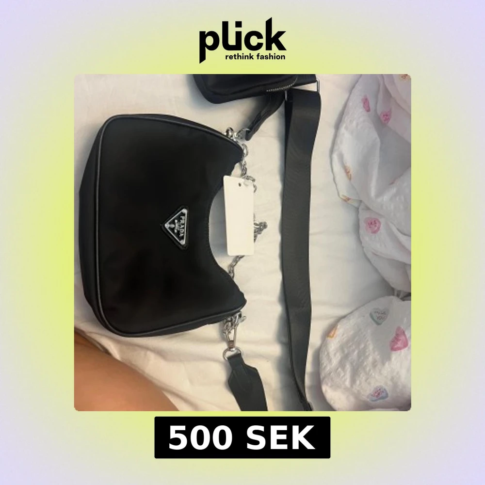 Snygg svart axelväska fmed silverfärgade detaljer, kedja och dragkedja. Väskan har en bred axelrem och en extra liten väska framtill, båda med Pradas ikoniska trekantslogga. Perfekt för dig som vill ha en trendig och praktisk väska.