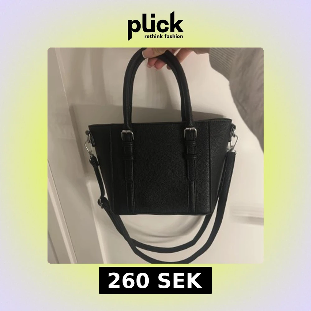 Stilren svart handväska i skinnimitation med både handtag och avtagbar axelrem. Väskan har en klassisk, fyrkantig form och silverfärgade metalldetaljer. Insidan har två fack med dragkedja och extra fickor för småsaker. Pris kan diskuteras.