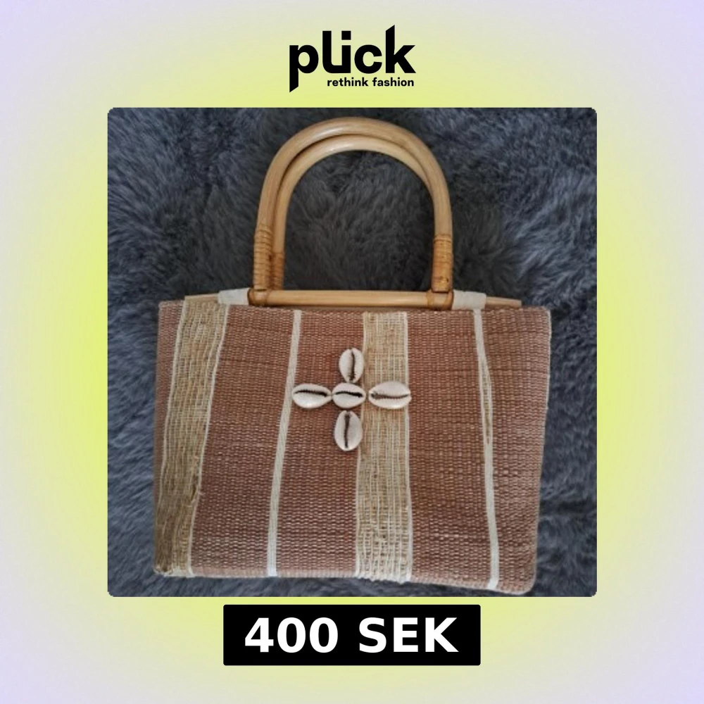 Snygg handväska i beige och brunt med naturliga bambuhandtag. Väskan har ett randigt mönster och är dekorerad med snäckor framtill. Tillverkad i vävt material och stängs med dragkedja. Perfekt accessoar för en chill sommarlook.