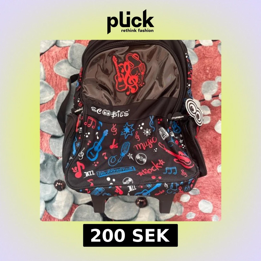 Supercool och praktisk ryggsäck från Scoobies med musiktema och färgstark design. Med teleskophandtag och hjul – kan användas både som rullväska och ryggsäck. Mycket rymlig med flera fack och sidoficka för vattenflaska. Helt ny och oanvänd. Perfekt för skolan eller resor.