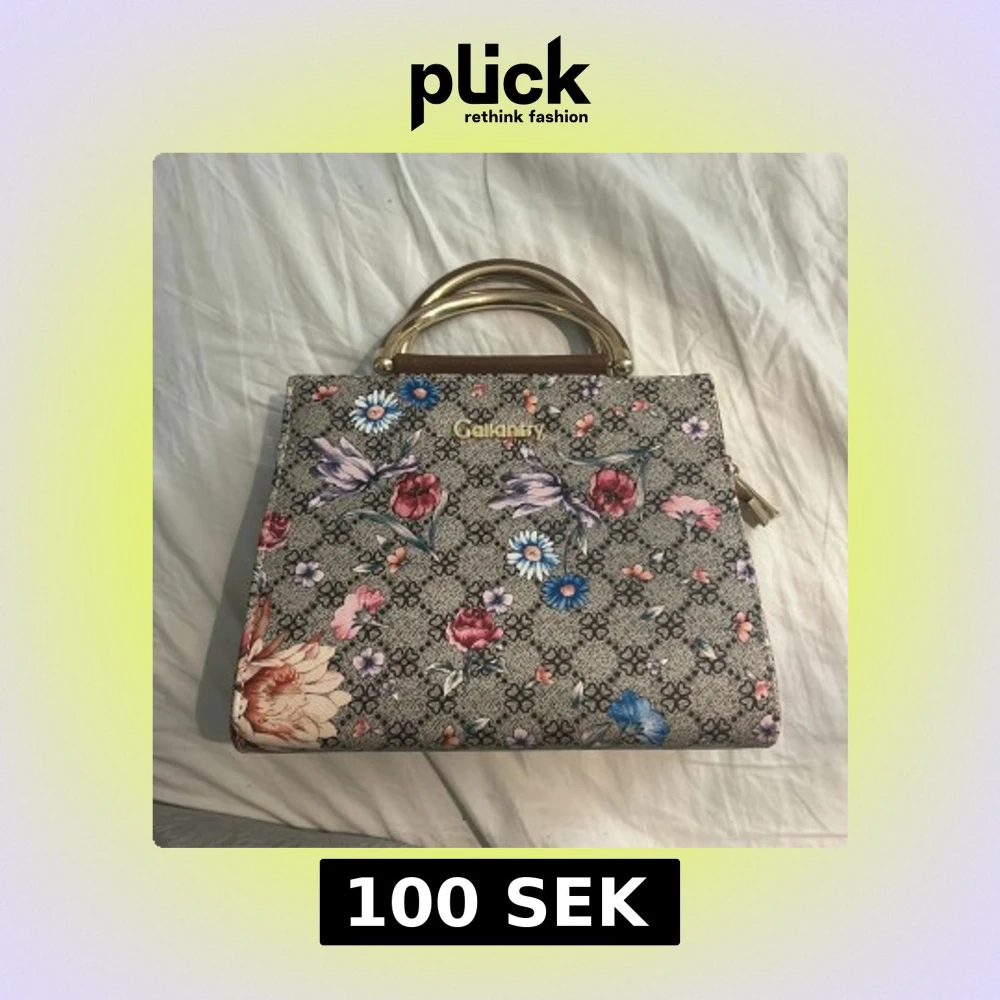 Snygg handväska från Gallantry med blommigt mönster i rosa, blått och rött på grå botten. Väskan har guldfärgade handtag och detaljer samt flera fack inuti med dragkedja. Materialet är syntet med inslag av brunt konstläder på insidan.