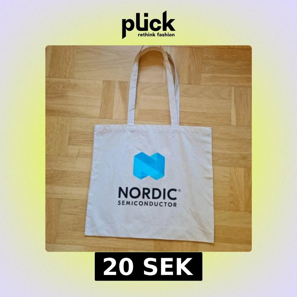 Oanvänd beige tygkasse i 100% bomull med tryck från Nordic Semiconductor på ena sidan och blått grafiskt mönster samt text på andra sidan. Perfekt för att bära böcker, laptop eller shopping. Långa handtag gör den enkel att slänga över axeln. Höjd 41cm. Bredd 46cm. Höjd inklusive handtag 75cm.