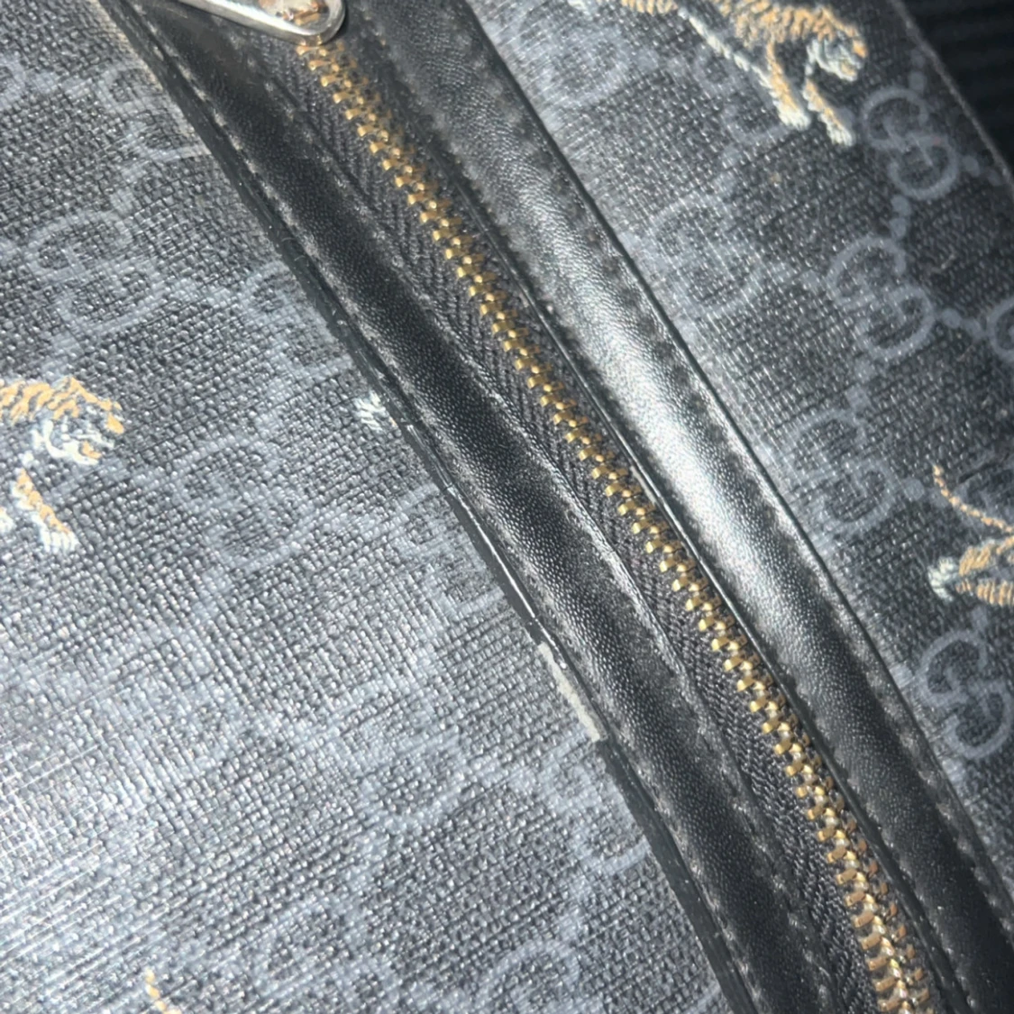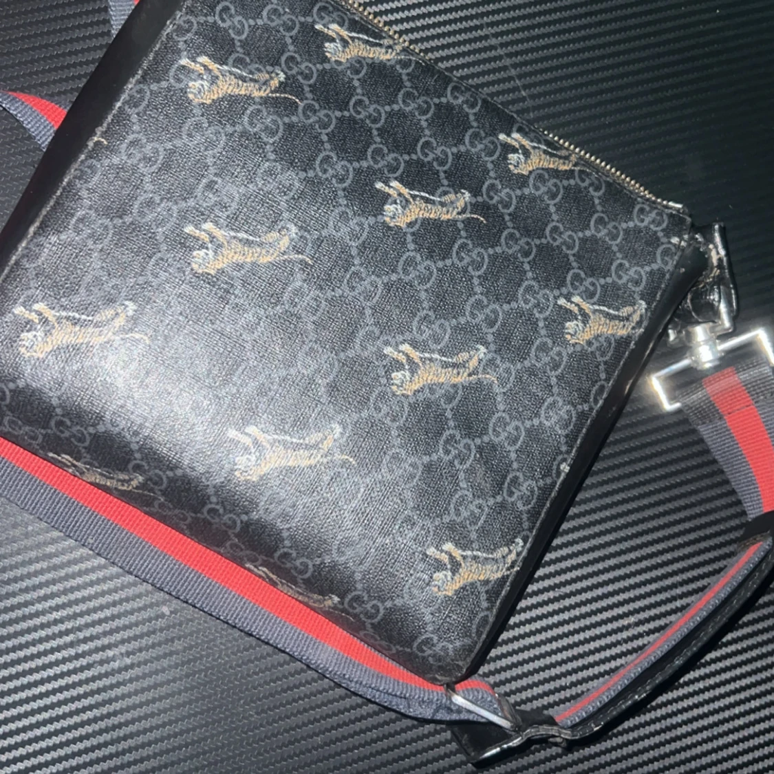 Svart axelväska från gg med klassiskt GG-mönster och små tigrar över hela väskan. Väskan har en bred axelrem i grått och rött, samt en praktisk dragkedja framtill. Materialet är skinn och insidan är fodrad i svart tyg. Perfekt för dig som vill sticka ut.