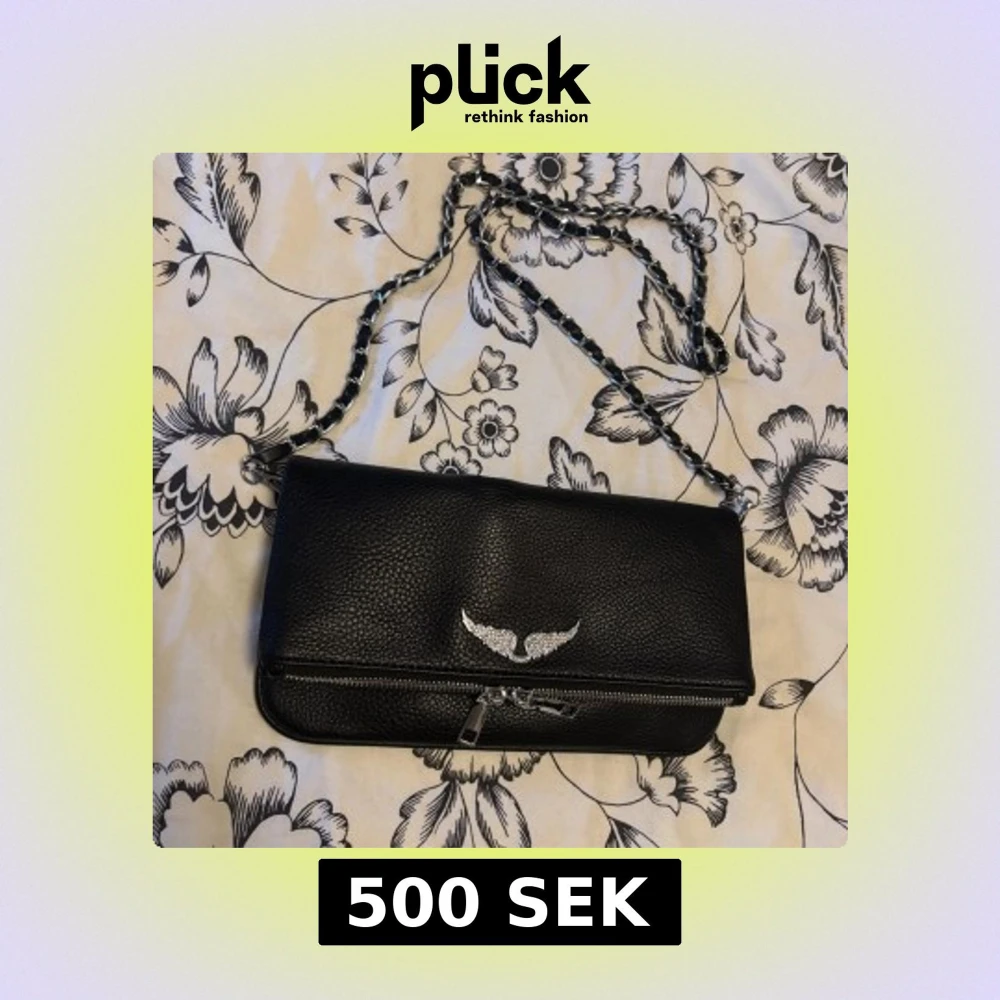 Snygg svart axelväska i skinn med silverfärgad kedja som axelrem. Väskan har ett dekorativt emblem med glittriga vingar på framsidan och dragkedja både fram och bak. Perfekt storlek för det viktigaste och cool detalj till din outfit.