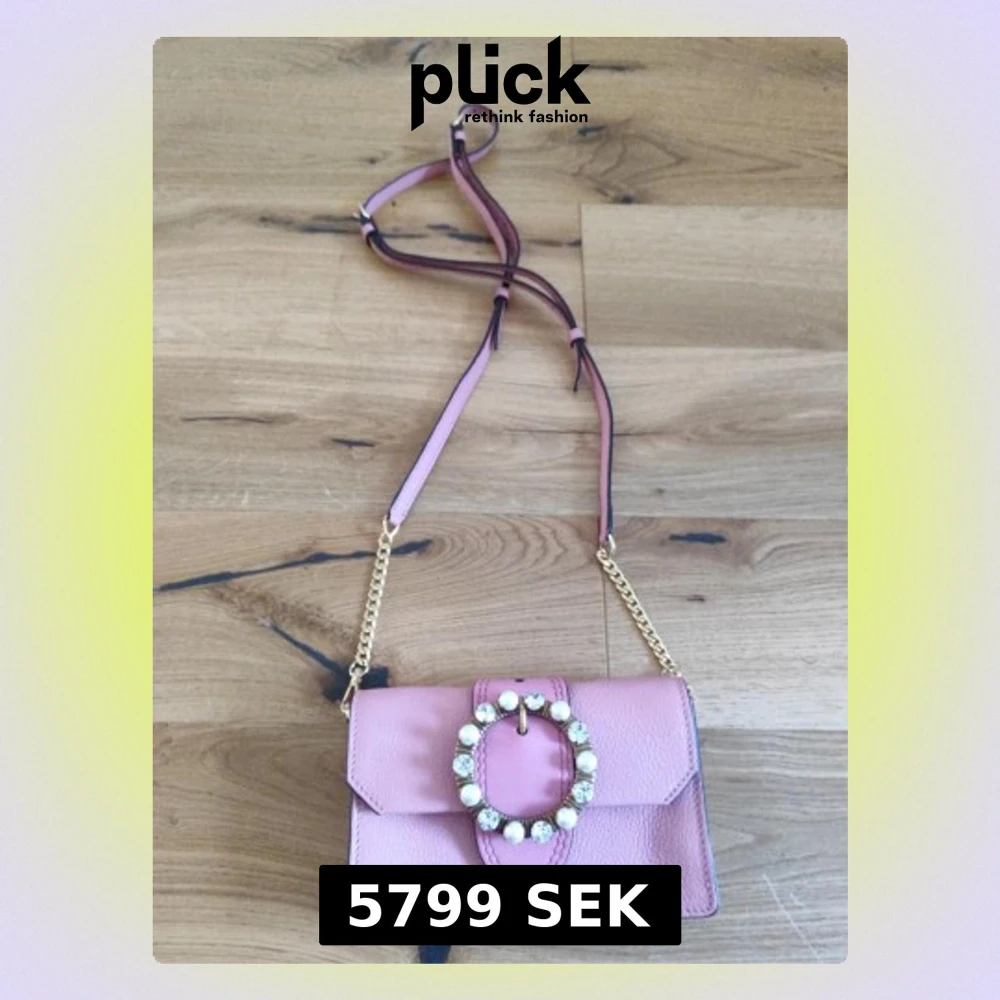Rosa axelväska från Miu Miu i skinn med guldfärgade kedjor och justerbar axelrem. Väskan har en stor pärl- och strassprydd spännesdetalj framtill och flera fack inuti för kort och småsaker. Perfekt för dig som vill sticka ut med en lyxig accessoar. Väskan har använts sparsamt och är i bra skick.