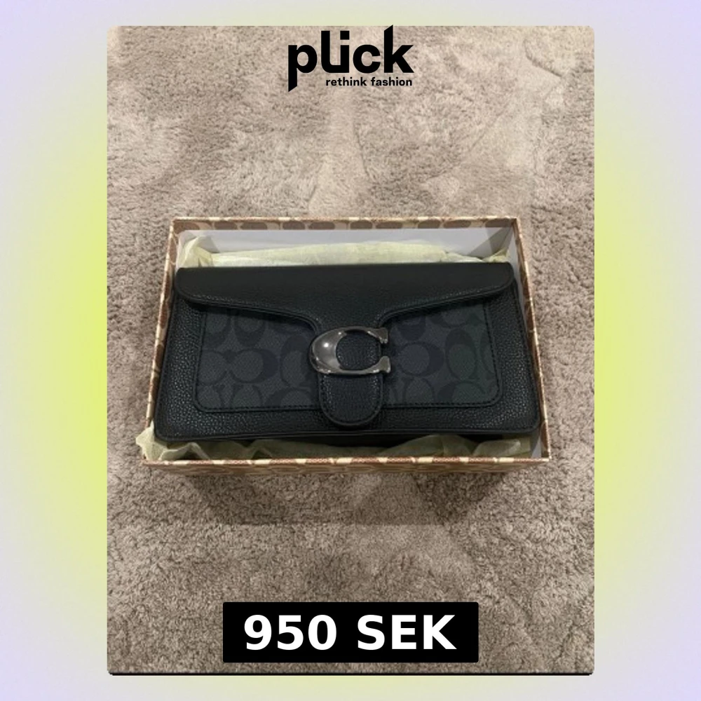 Snygg svart axelväska från Coach med klassiskt monogrammönster och stor metallspänne framtill. Väskan har avtagbar och justerbar axelrem, perfekt för att bära crossbody. Tillverkad sop skinn och polyester, levereras med originalbox och dustbag.