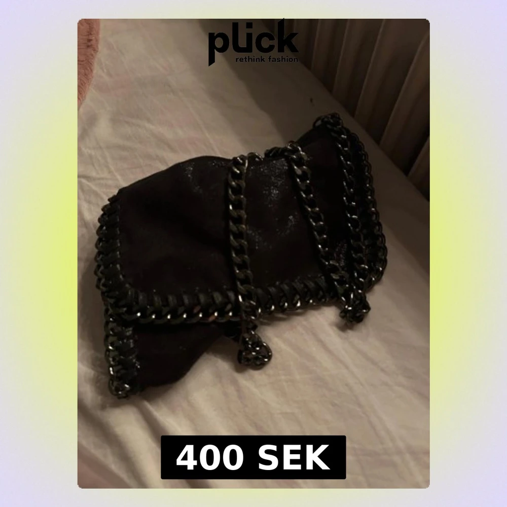 Säljer en svart axelväska med glansig yta och grova kedjor längs kanterna och som axelrem. Väskan har en mjuk form och är tillverkad i mocka med metallkedjor som ger en cool och edgy vibe. Perfekt för dig som gillar statement-accessoarer.