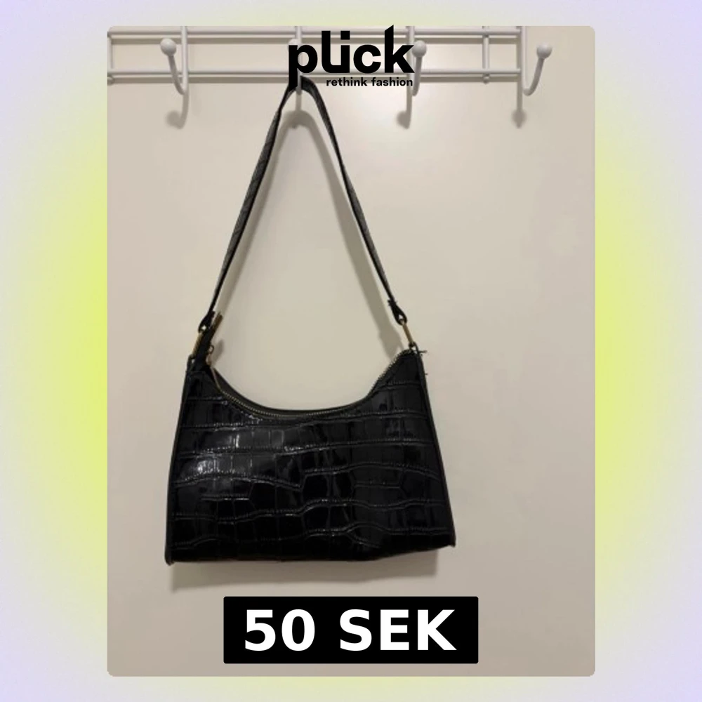 Snygg svart axelväska med croco-mönstrad yta och glansig finish. Väskan har en rak, avlång form och ett brett axelband med metallfästen. Stängs med dragkedja upptill och är perfekt för dig som gillar stilrena detaljer.