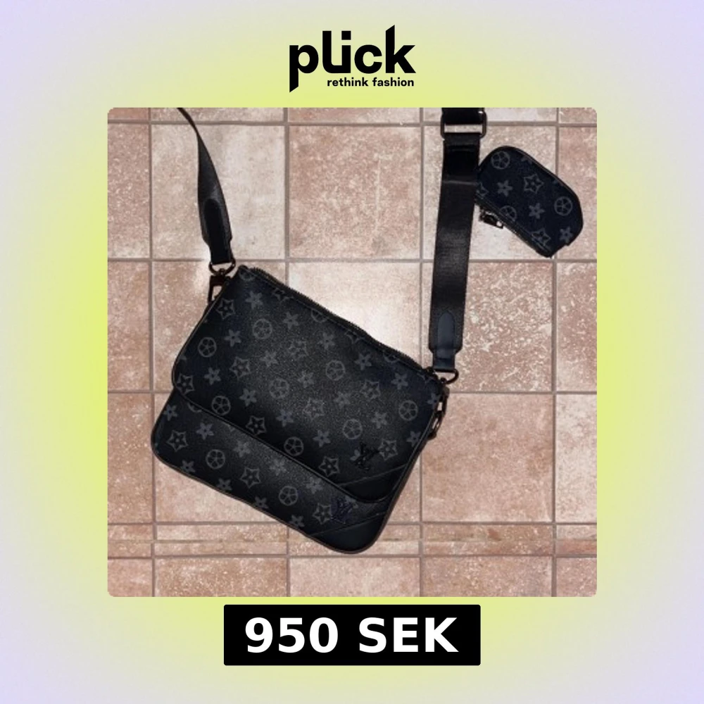 Helt ny. Snygg svart axelväska med klassiskt monogrammönster i grått. Väskan har justerbar axelrem, flera fack med dragkedja och en liten avtagbar plånbok. Tillverkad i skinn med detaljer i svart och grått. Perfekt för dig som vill ha en stilren och lyxig look.