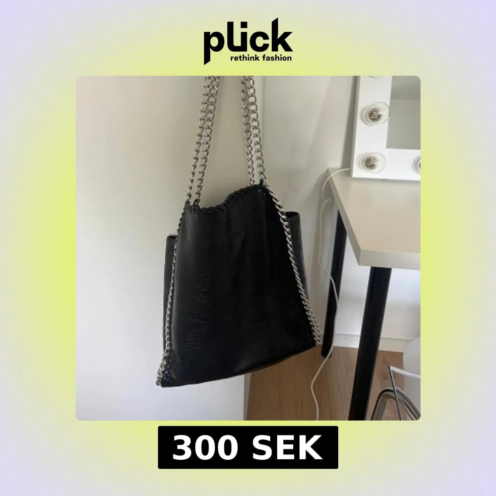 Snygg svart axelväska i skinnimitation med grova silverfärgade kedjor som axelrem. Väskan har en stilren och modern design med mjuk struktur och kedjedetaljer längs kanterna. Perfekt för dig som gillar en edgy och trendig look.