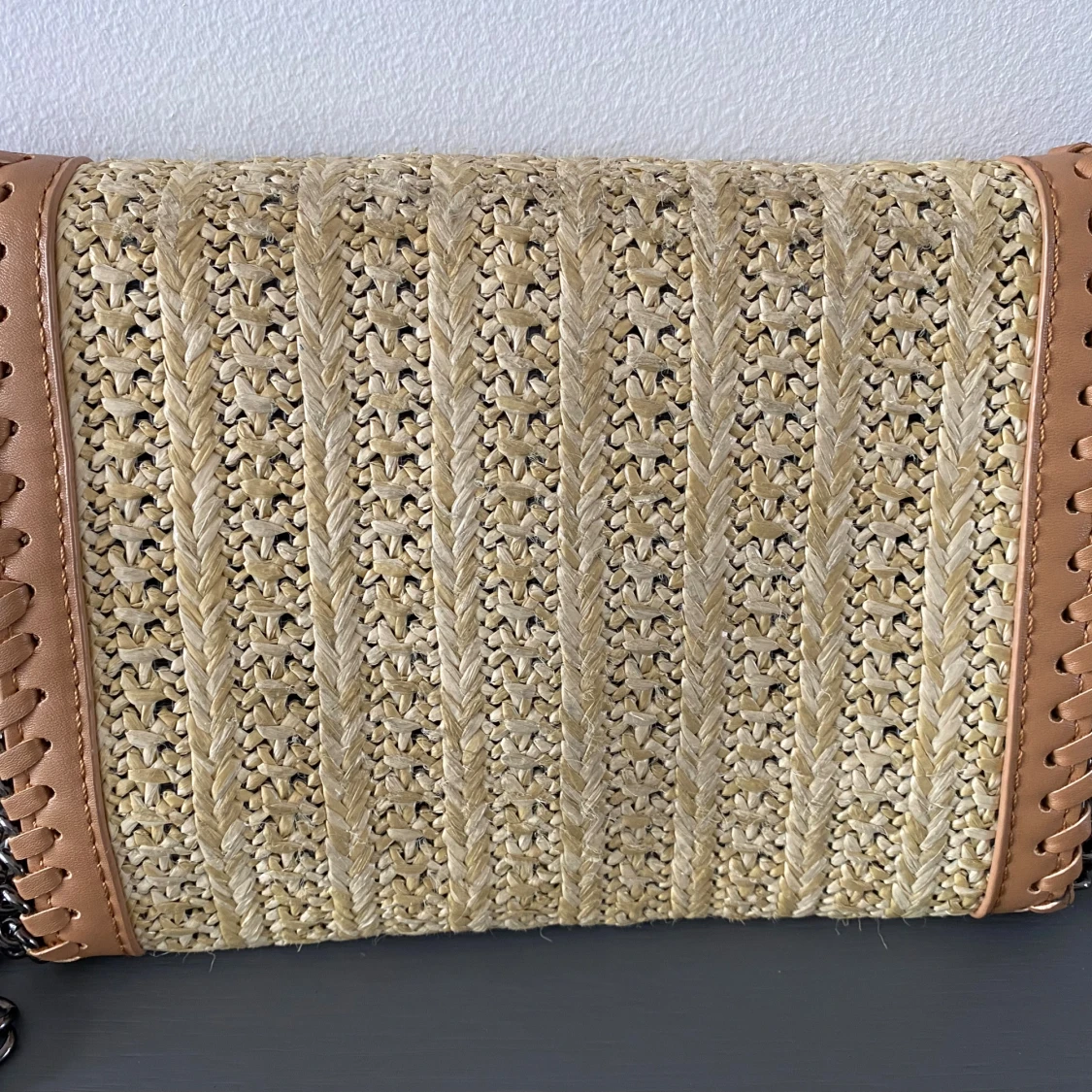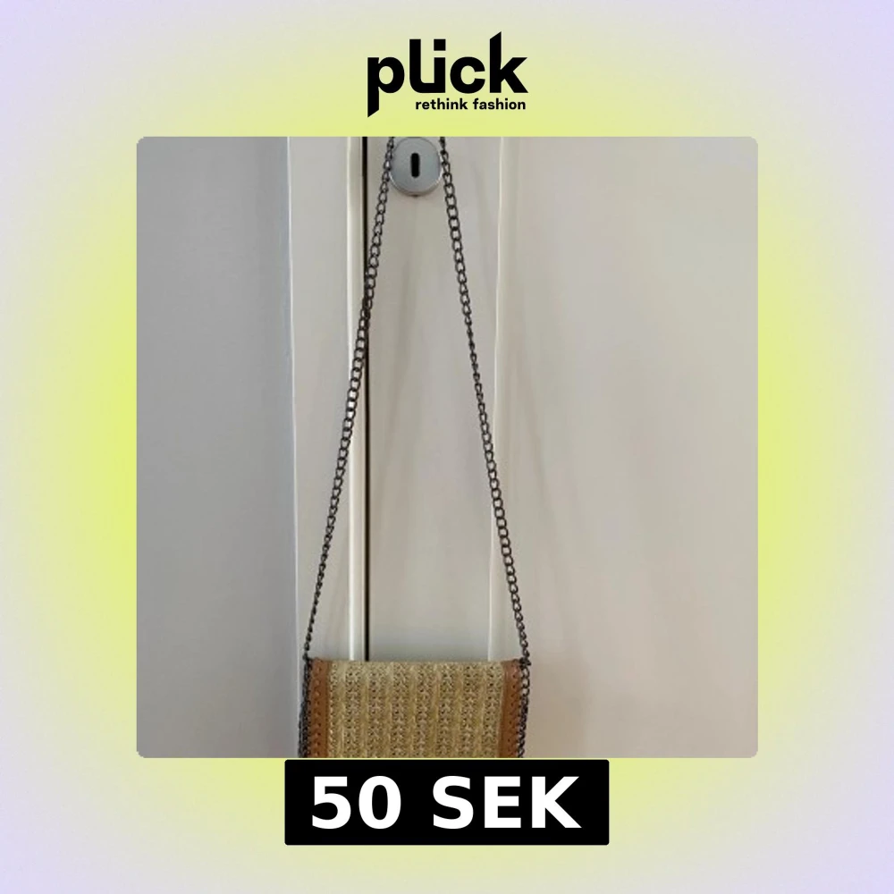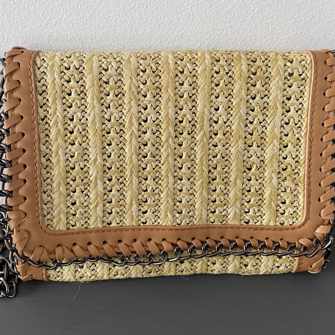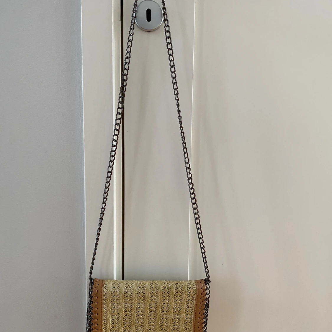 Snygg beige axelväska med flätad front i naturmaterial och detaljer i brunt skinn. Väskan har en lång kedjerem och stängs med magnetlås. Insidan har flera fack, inklusive ett med dragkedja. Perfekt för dig som gillar en boho-inspirerad stil. Mått Bredd: ca 23 cm Djup: ca 3 cm Höjd: ca 16 cm Kommer från ett djur och rökfritt hem.